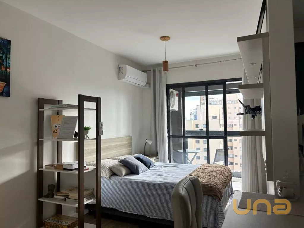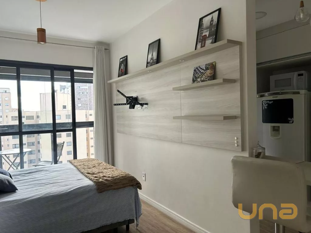 Studio com 37 metros de área útil, sacada com churrasqueira, mobiliado.