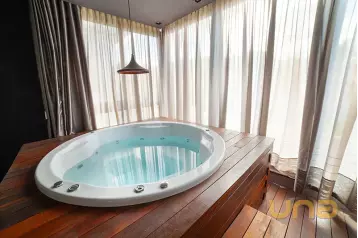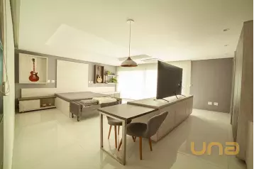 No térreo, os ambientes são espaços, integrados e funcionais: lavabo, quarto e banheiro de serviço, e uma área social voltada para o lazer, onde a churrasqueira e a jacuzzi criam o cenário perfeito para receber com estilo. O porcelanato nos ambientes confere um toque contemporâneo e de fácil manutenção.